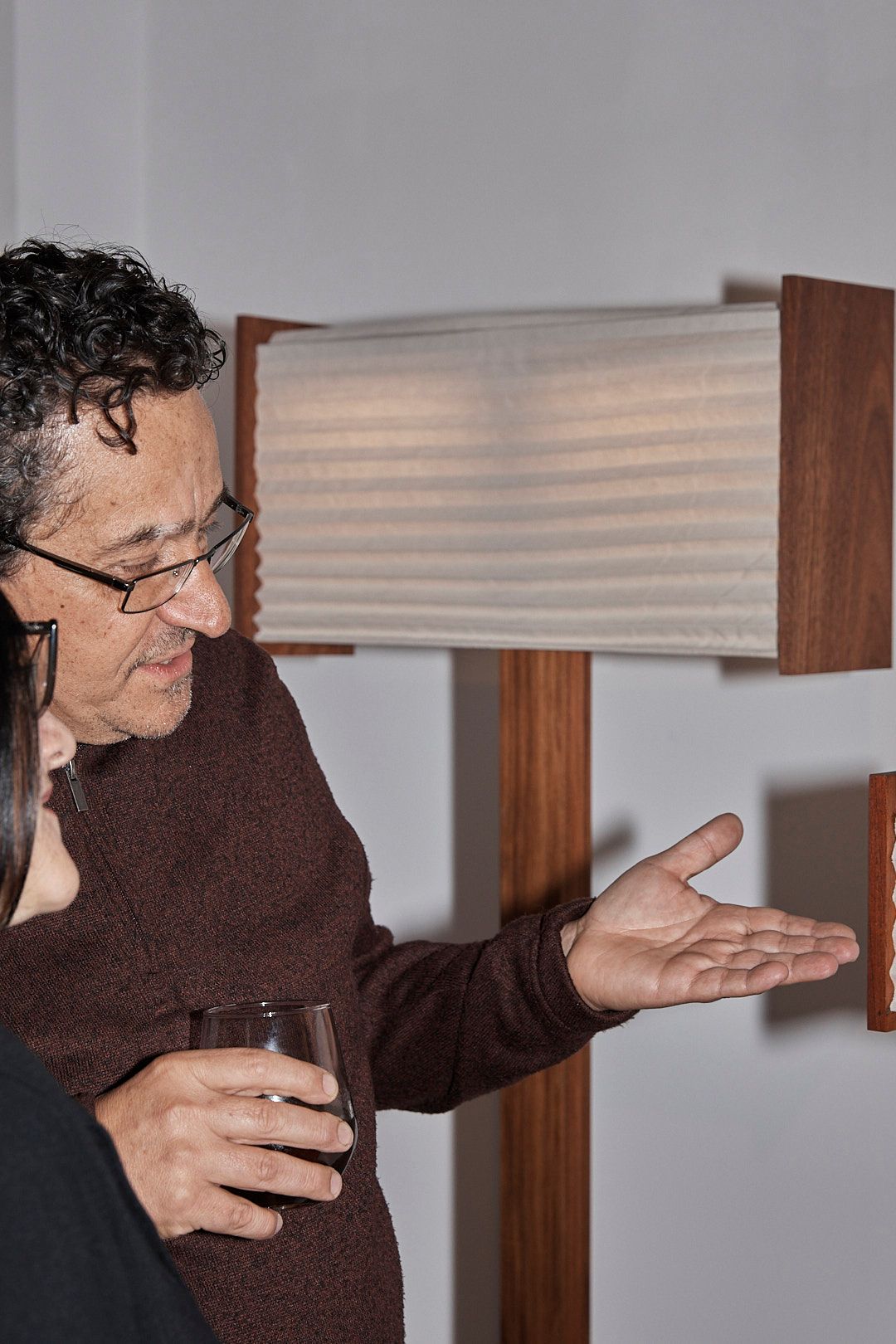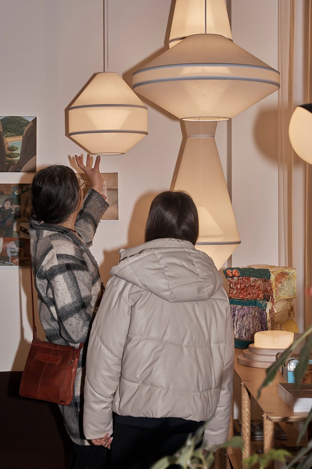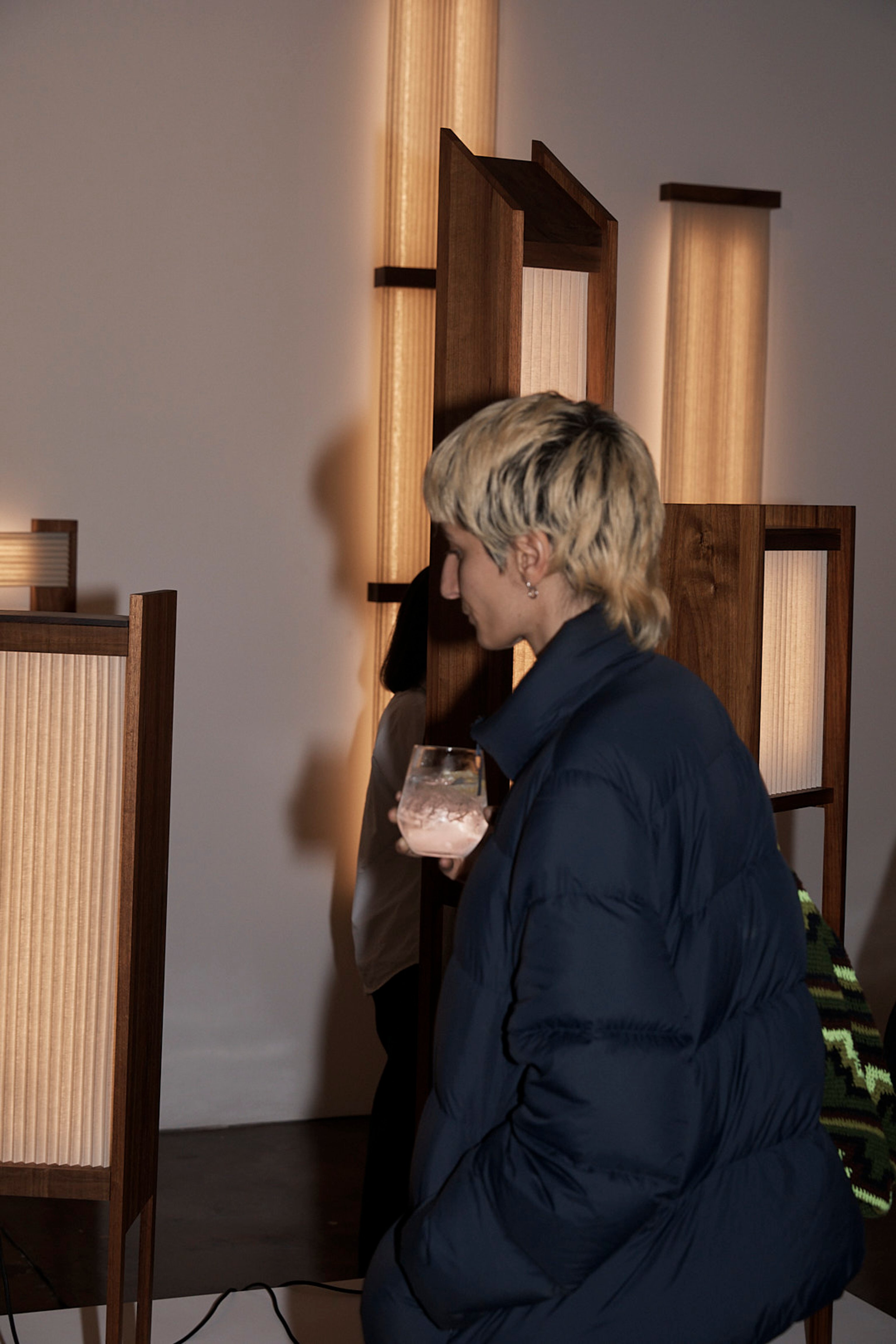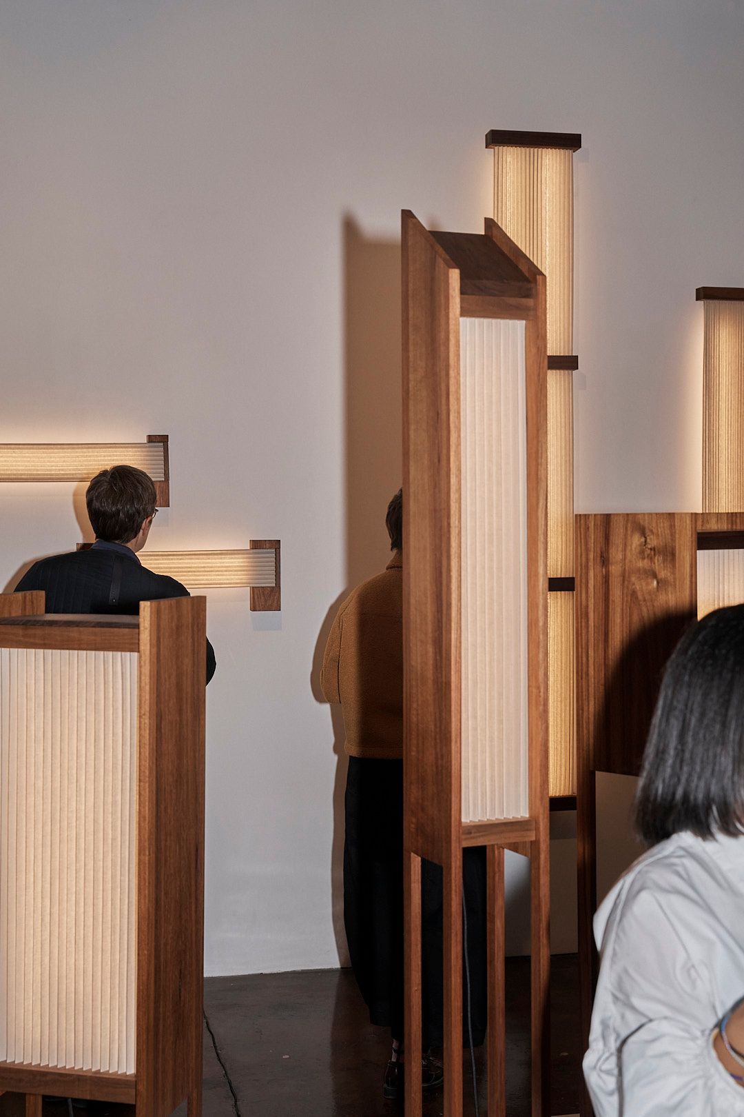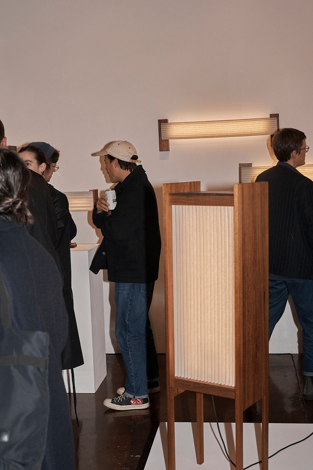 In an effort to highlight the history and legacy of Specialty Pleaters, an almost century-old pleating factory, the pieces explore various systems of clamping, hanging, and pinning pleats to create lighting sculptures. Combining pleated linen with reclaimed timber, the material contrast emphasises the delicate, nuanced, and ephemeral nature of pleating. Inspired by modernist architecture, the interface between materials, and ceremony, these lights offer a warm glow, much the same as a glimpse through a window at dusk.