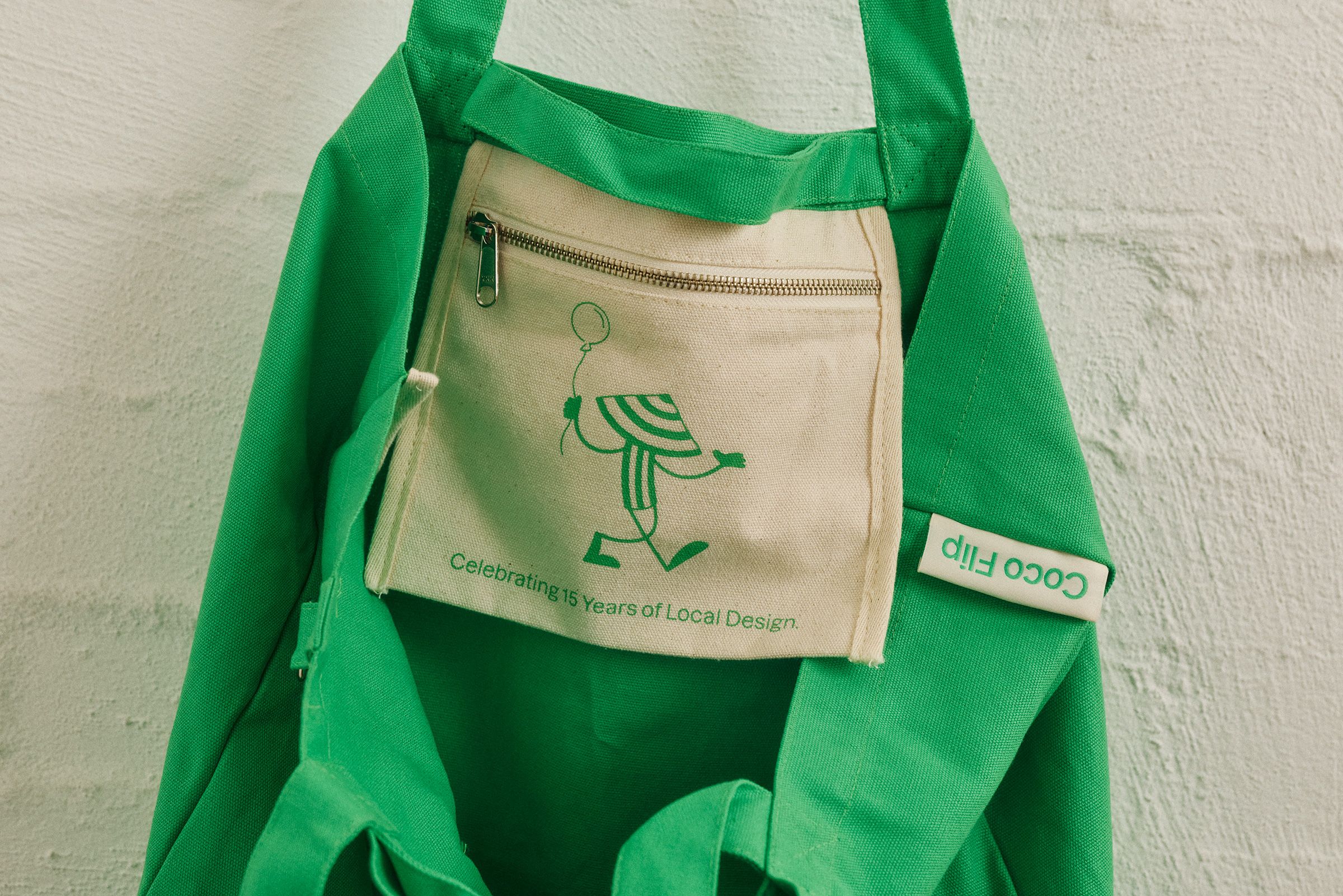 Created to celebrate Coco Flip’s 15-year anniversary, this limited-edition green tote is roomy, easy to carry, and ready for everyday outings. It includes long and short handles, an external pocket, a secure internal zip pocket, and a D-ring key loop. Finished with a playful illustration by Sam Phillips, it’s a reliable companion for market runs, beach days, and everything in between.